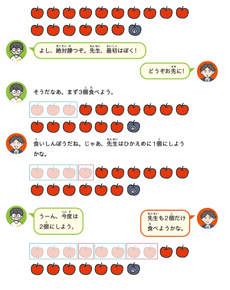 「最初のりんごの数を変えてみる」「最後の1個を取った人を勝ちにしてみる」「1回に食 べられるりんごの数を変えてみる」など、ルールを少し変えて遊んでみるのもおもしろいですよ。それぞれに必勝法があるので、ぜひ考えてみてください。