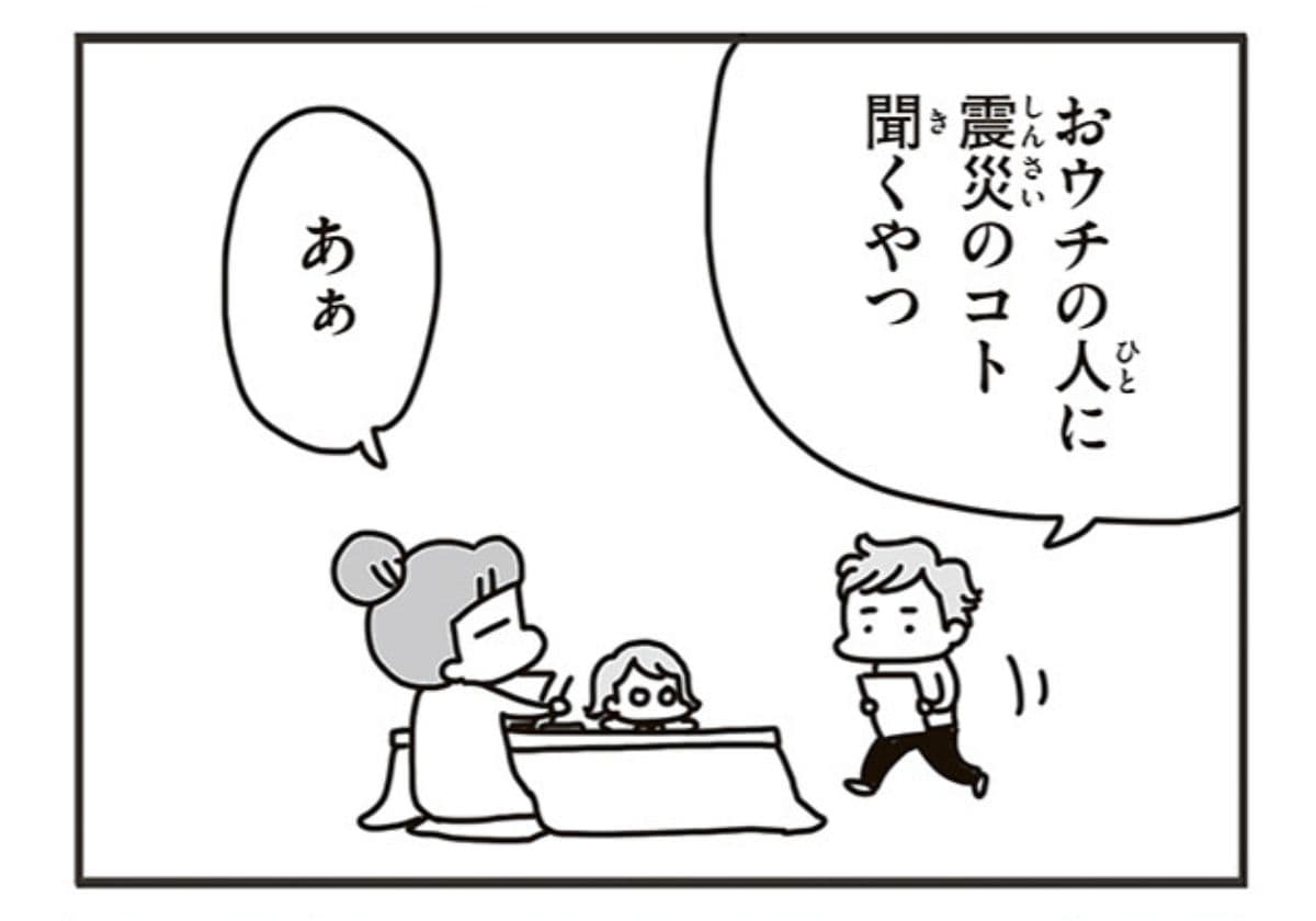 東日本大震災の当時、アベナオミさんは自宅避難で日々を乗り切りました。そのためか、当時のたいへんさを話しても、子どもたちにはどこか実感が伝わりません。